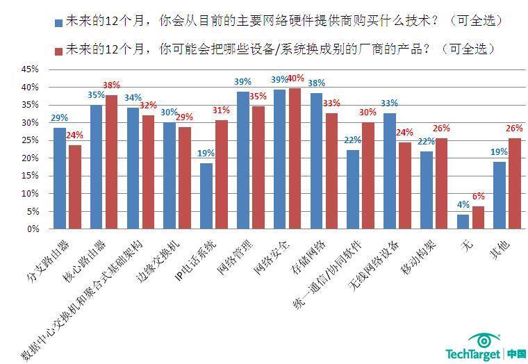 未来12个月,企业可能会把哪些设备/技术更换为别的厂商的产品?网络安全仍然以四成的比例稳居第一,看来网络安全这片重灾区是企业的一大心病。核心路由器由第三上升为第二,网络管理位居第三。而存储网络排名第四。